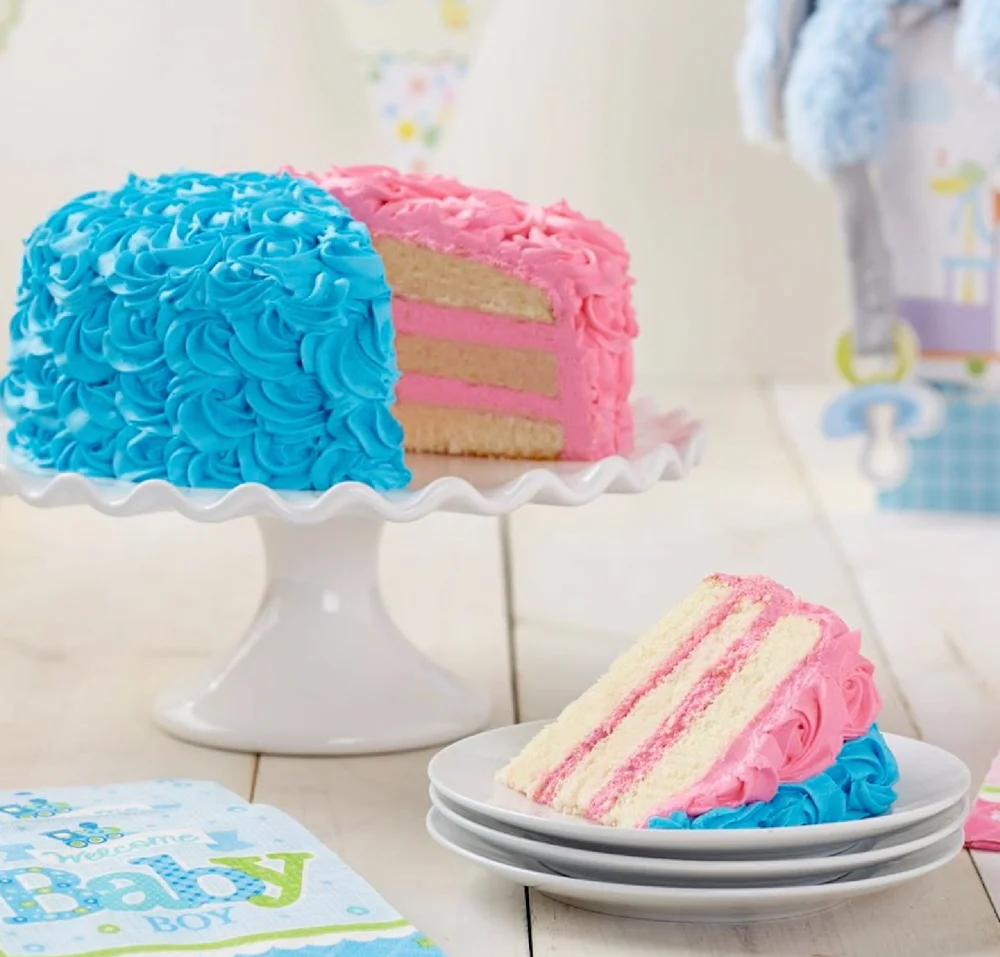 O bolo é o elemento mais utilizado nos chás de revelação, sendo que a surpresa quanto ao sexo do bebê estará em seu interior. No geral, a pessoa que ficou responsável por organizar a festa irá encomendar um bolo e pedirá para a confeitaria fazê-lo com uma camada externa em cor neutra e com a massa ou o recheio colorido. Assim, ao cortar o bolo, os pais e todos os convidados descobrirão pela cor de seu interior qual é o sexo da criança.